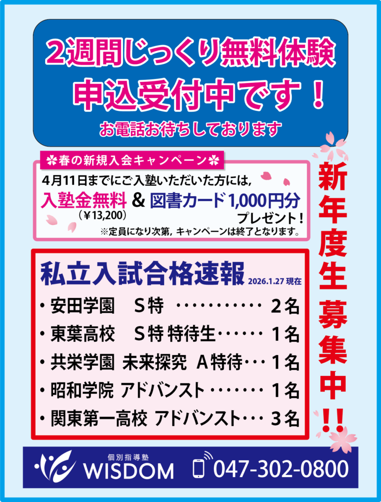 千葉県の公立高校入試では,中学校3年間分の内申点が入試の合否に影響するシステム 。中1の頃からしっかりと内申点をとっておくことが,後々の大きな貯金となるのです!